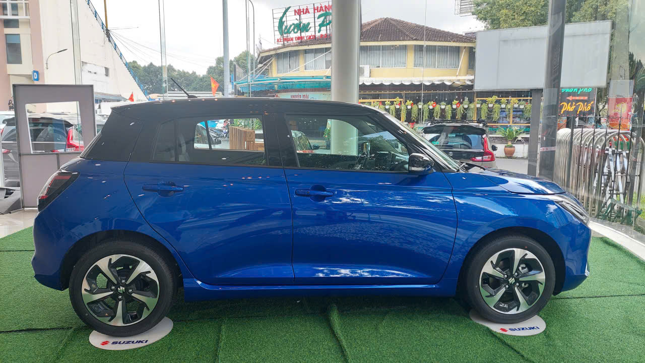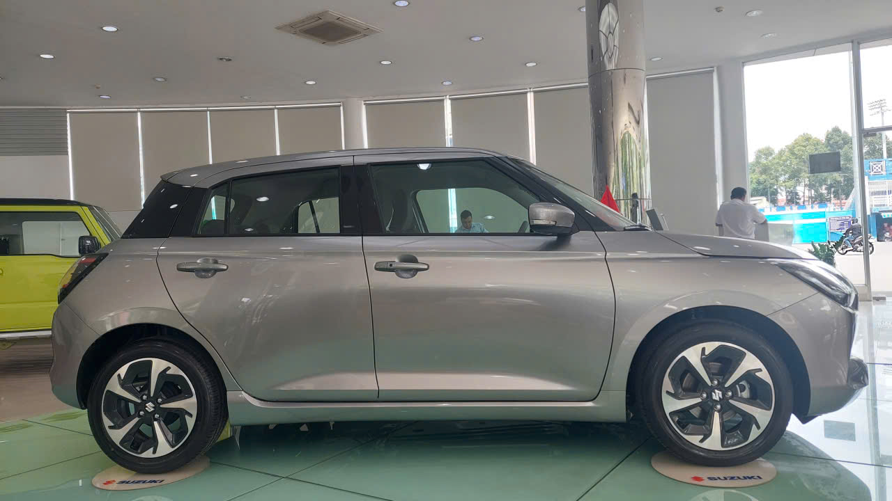 Nhìn ngang từ phía thân xe Suzuki Swift 2025 trang bị mâm đúc hợp kim 16 inch với bề mặt phay xước thể thao. Gương chiếu hậu chỉnh điện, gập tự động, tích hợp đèn báo rẽ, cảnh báo điểm mù, sấy gương. tay nắm cửa được bố trí theo kiểu thiết kế truyền thống. Ngoài ra, thân xe cũng thiết kế những đường gân dập nổi chạy dọc từ trước ra sau, cùng với ốp sườn xe thể thao.